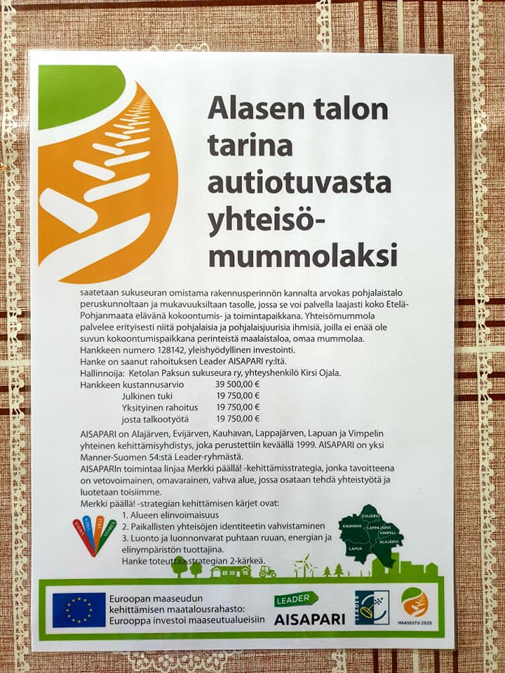 Viimeinkin on saatu maaliin merkittävä asia, hanketuki Alasen talon kehittämiseksi Yhteisömummolaksi. Aisapari ry. ja ELY-keskus myönsivät sukuseuralle 19 750 euroa tukea, ja sukuseuran oma osuus on kehittämishankkeesta on arvoltaan samansuuruinen, ja koostuu talkootyöstä. Hankkeen arvo on kokonaisuudessaan 39 500 euroa. Suurella innolla lähdemme nyt toteuttamaan toimenpiteitä suunnitelman mukaan ja kutsumme siihen kaikkia kiinnostuneita. Sukuseura on nyt yleishyödyllinen eli avoin myös muille kuin suvun jäsenille. 20.6.2020